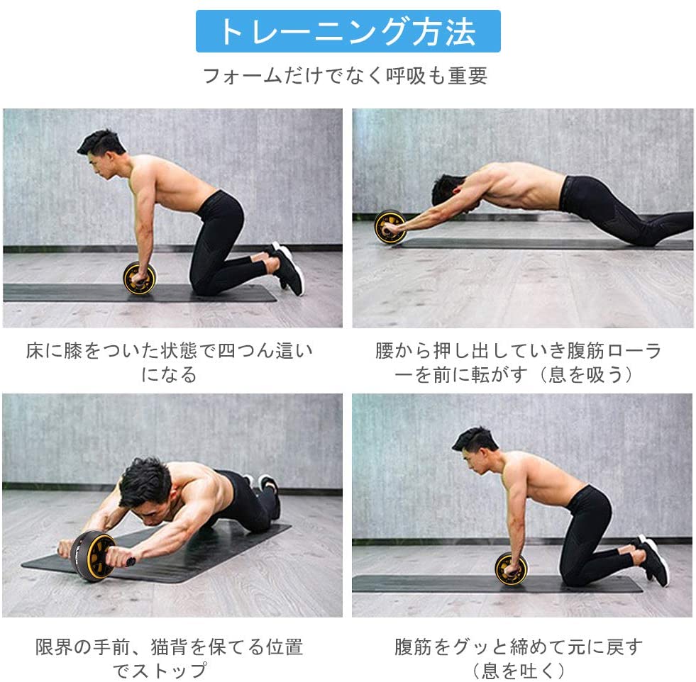 ・トレーニングの頻度:基本は10回×3セット腹筋ローラーでトレーニングし翌日に筋肉痛を起こすほどお腹周りの部位を追い込み、1分の休憩時間(レスト)を挟み、3セットを目安に繰り返す。最初は週3日ほどが推奨されている。これは筋トレすべてに言えることですが、トレーニングによって傷ついた筋繊維は時間をかけて修復されていきます。これによって筋肉がパワーアップする「超回復」が体内で行われるので、最低でも24時間は空ける必要があるのです。この超回復を繰り返すことでどんどん筋繊維は大きくなっていき、理想的なムキムキボディが完成されます。